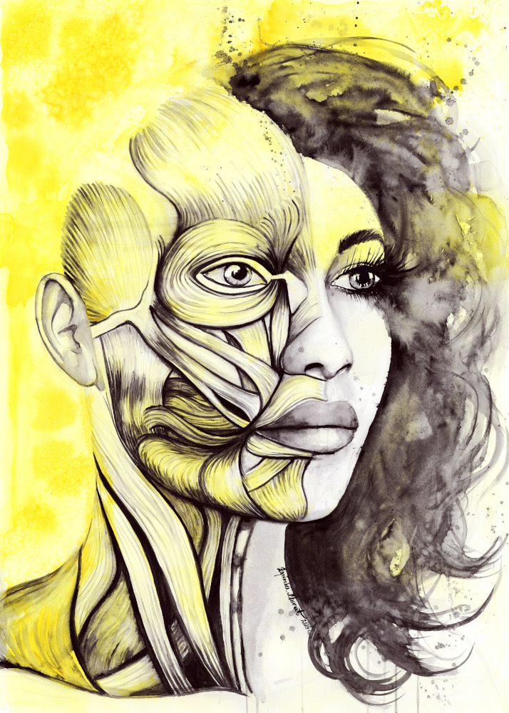 Odkryj niezwykły plakat w odcieniach żółci i czerni, który w wyjątkowy sposób łączy estetykę z wiedzą anatomiczną. Jego kompozycja to artystyczne spojrzenie na twarz kobiety, której połowa ukazuje naturalne piękno, a druga – precyzyjnie wyrysowane mięśnie mimiczne.